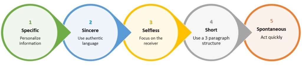 Whether you’re writing thank-you notes, congratulatory messages, or expressions of sympathy, follow the “5 S” principles of effective goodwill messages illustrated in Figure 7.3.4.
